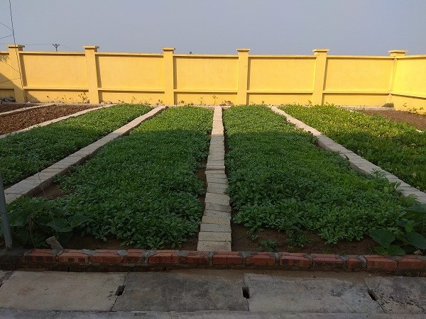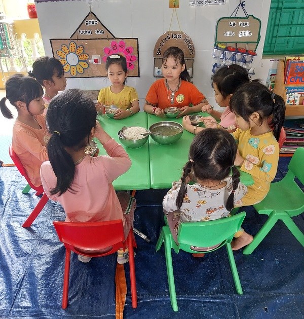 Các con trong trường được sử dụng rau sạch do các cô nhân viên nấu ăn tăng cường trồng tại vườn trường