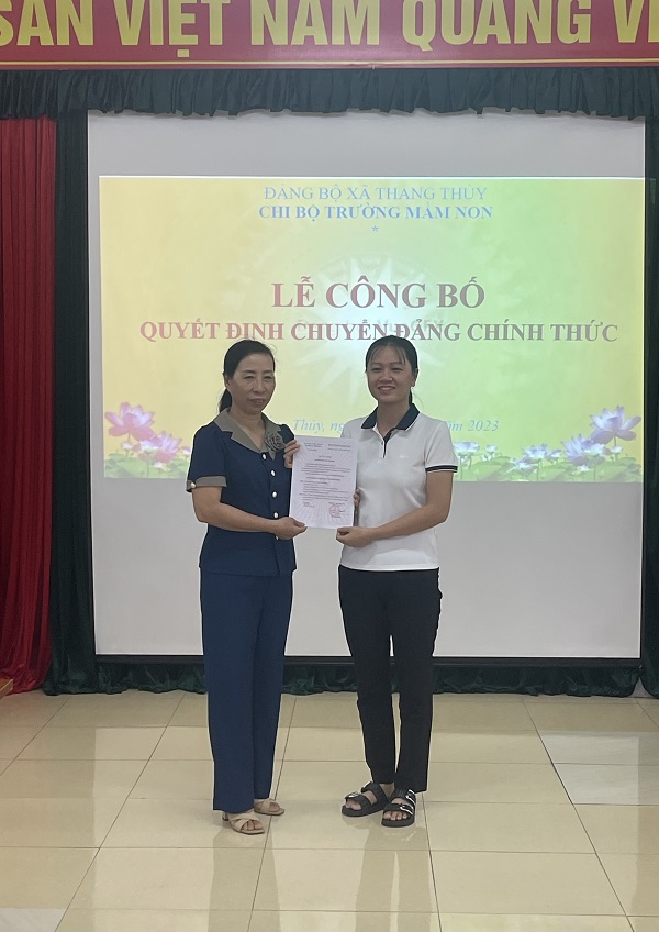 Sau một thời gian theo dõi Đảng. Đồng chí Bùi Thị Hương đã có những rèn luyện, tu dưỡng đạo đức đồng chí đã có nhiều thành tích tốt trong các năm học. Vì vậy sáng ngày 27/09/2023 chi bộ Đảng trường mầm non Thắng Thuỷ đồng chí Nguyễn Thị Viển- Bí thư chi bộ- Hiệu trưởng nhà trường đã tổ chức lễ công bố quyết định chuyển Đảng chính thức cho đồng chí Bùi Thị Hương.