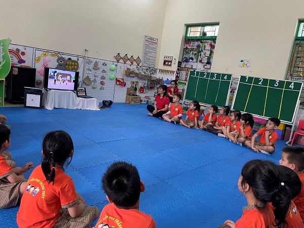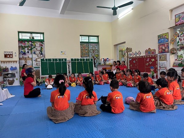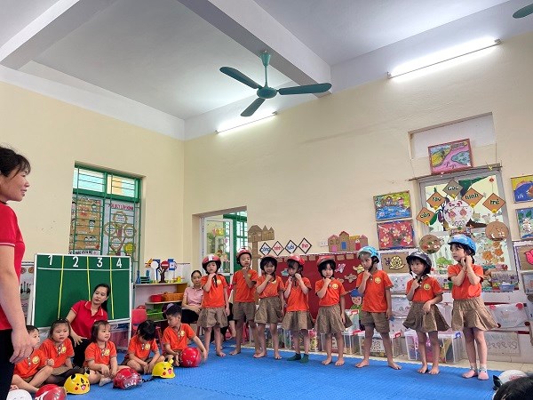 Cô và trẻ hát bài hát: Em đội mũ bảo hiểm