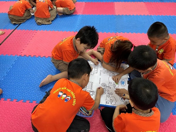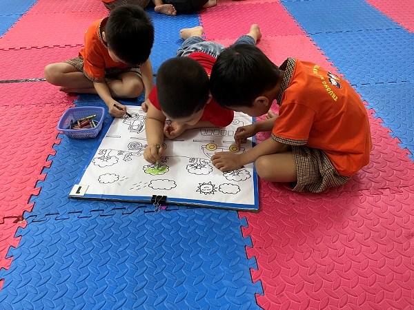 Cô đến từng nhóm trẻ bao quát nhắc nhở trẻ phối kết hợp cùng nhau tô tranh