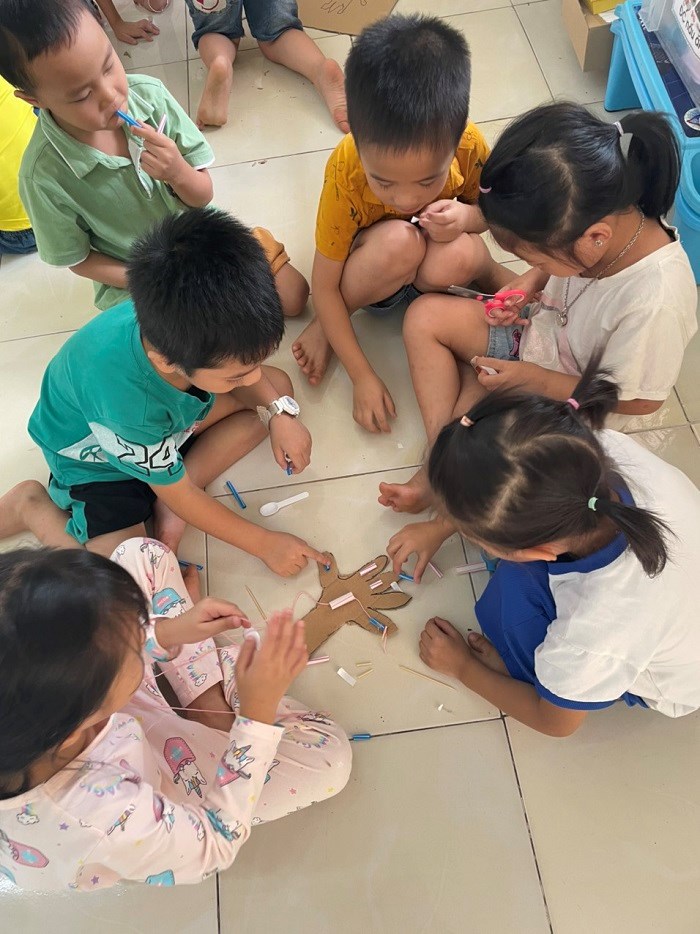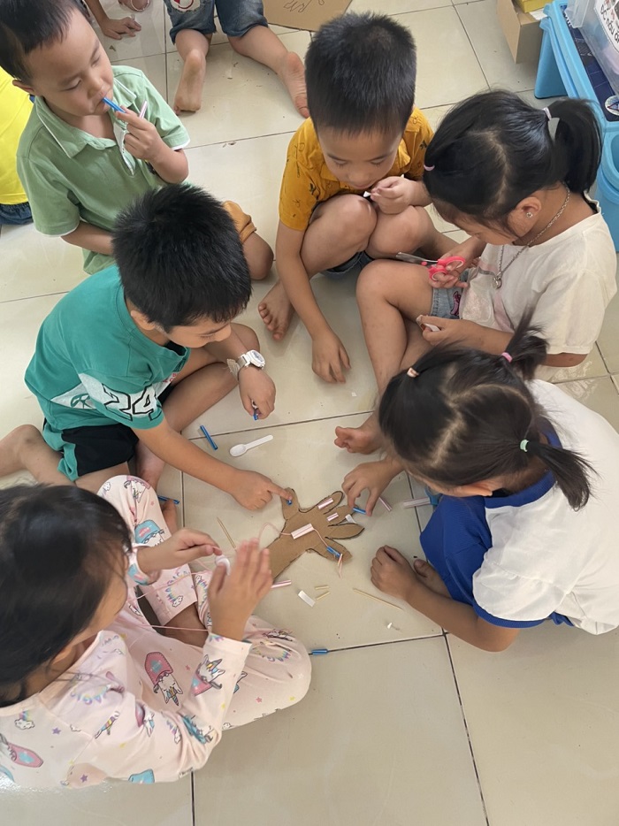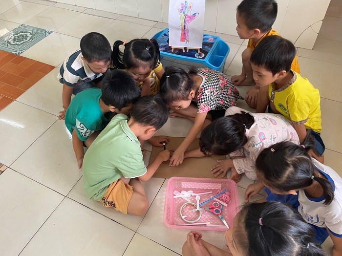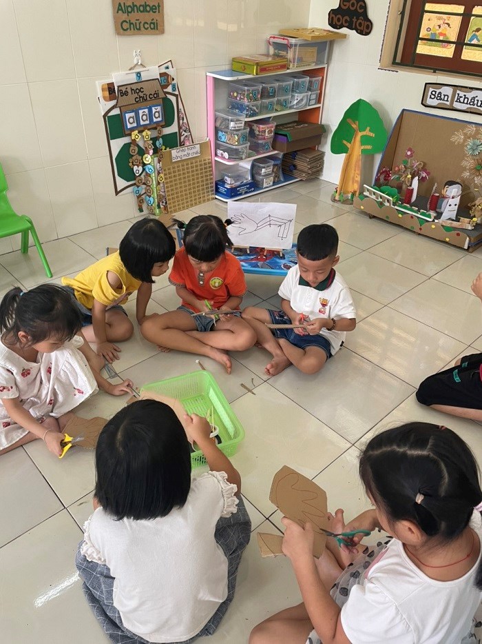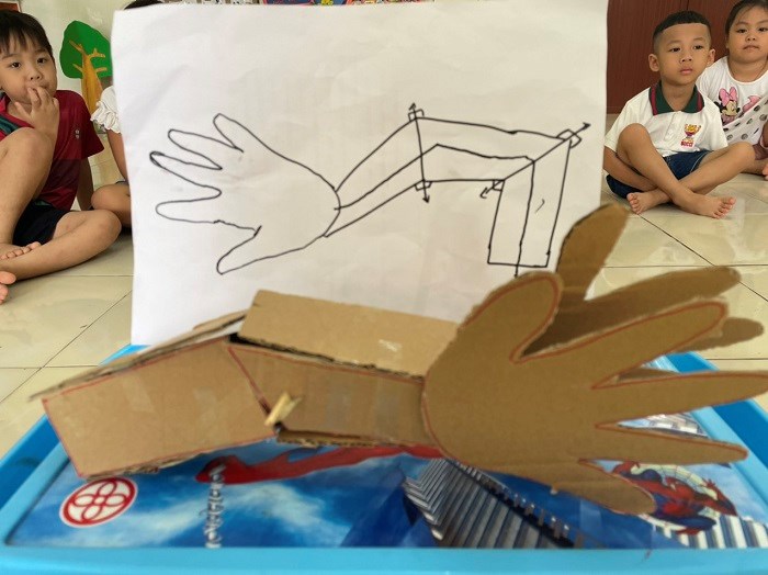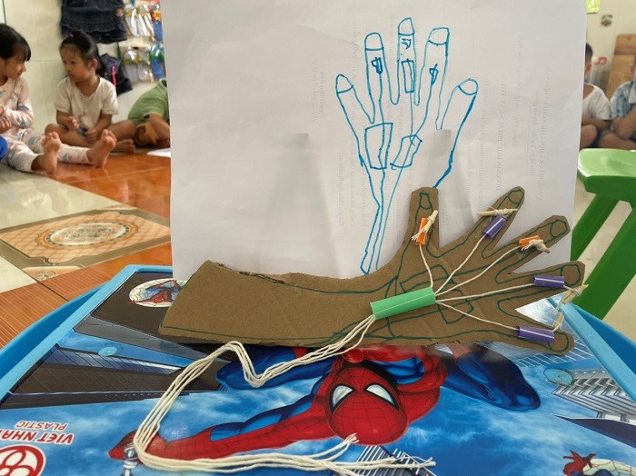 Trẻ lựa chọn nguyên liệu và thực hiện chế tạo ra bàn tay cử động