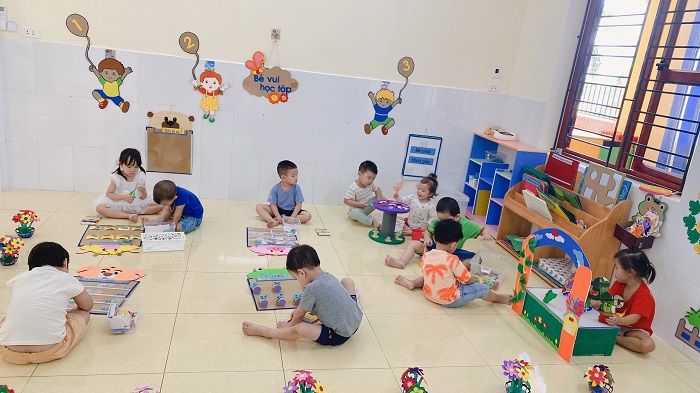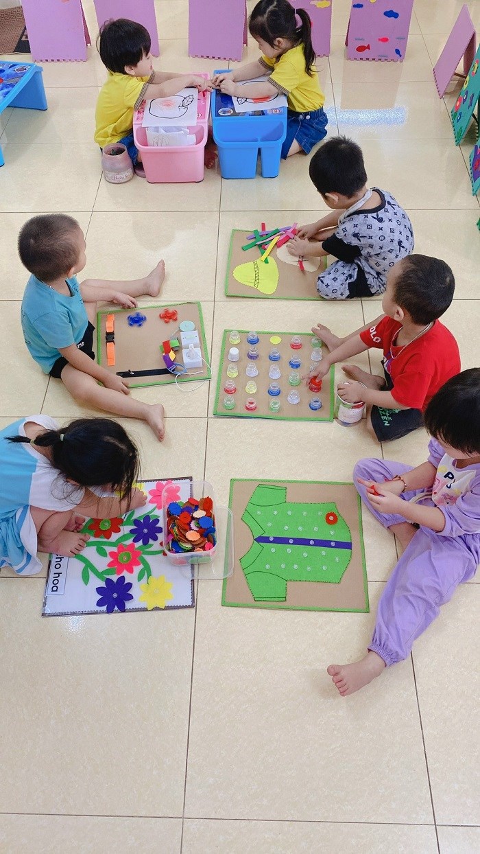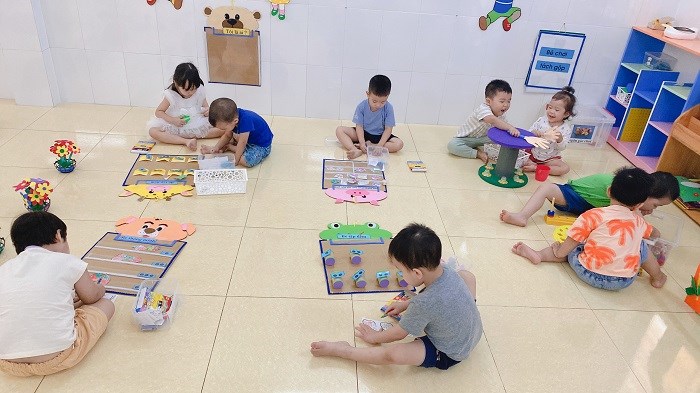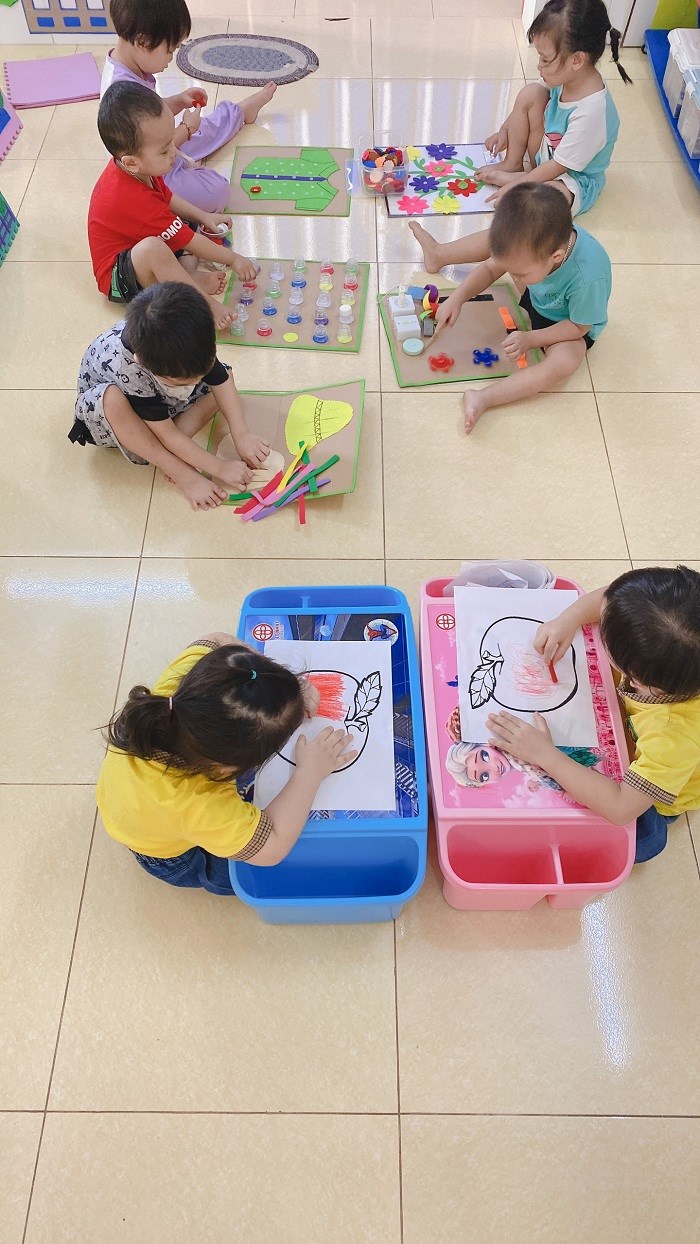 Thực hiện chế độ sinh hoạt một ngày của bé tại trường. Các bé lớp 3 tuổi 2 cùng tham gia hoạt động góc tại các góc chơi với sự hướng dẫn của giáo viên trẻ được lựa chọn góc chơi, trẻ được tham gia trải nghiệm học tập vui chơi, tự do sáng tạo tại các góc chơi của mình. Thông qua các góc chơi trẻ được đóng vai làm người lớn. Tạo cho trẻ hứng thú muốn tìm tòi khám phá thế giới xung quanh không chỉ thế còn giúp trẻ mạnh dạn, tựu tin phát triển ngôn ngữ, tư duy sáng tạo nhanh nhạy hơn. Qua đó còn rèn cho trẻ ý thức tự giác sau giờ học chuyển hoạt động linh hoạt hơn, trẻ có tính đoàn kết hơn trong các giờ học và làm việc nhóm