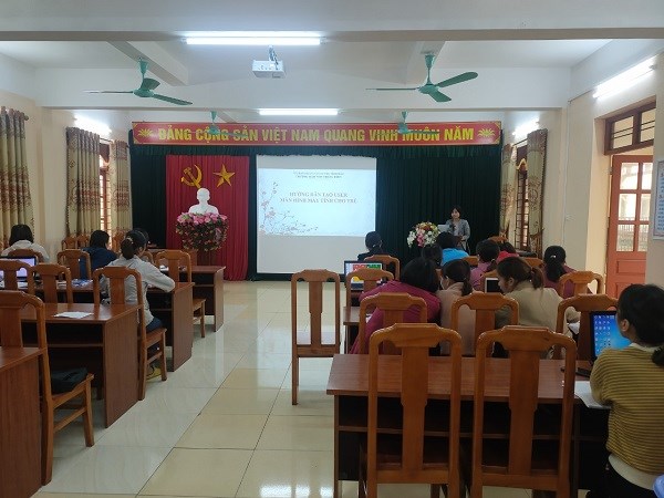 Thực hiện về công tác chuyển đổi số, áp dụng trong công tác tổ chức các hoạt động giáo dục trẻ, đồng chí Nguyễn Thị Hiền - tổ trưởng chuyên môn kết hợp đồng chí Phạm Thị Thường - Tổ phó chuyên môn đã triển khai hướng dẫn cách tải và sử dụng APP ANIMAL 4D trong dạy học. Hướng dẫn 1 số đồng chí giáo viên mới được chuyển về trường cách tạo màn hình user của cô, của trẻ. Trong buổi sinh hoạt chuyên môn đồng chí Phạm Thị Xuân Phương - Phụ trách công nghệ thông tin nhà trường hướng dẫn cách đăng tải bài trên trang website của nhà trường .