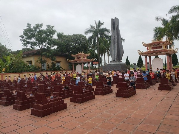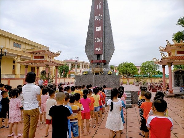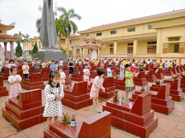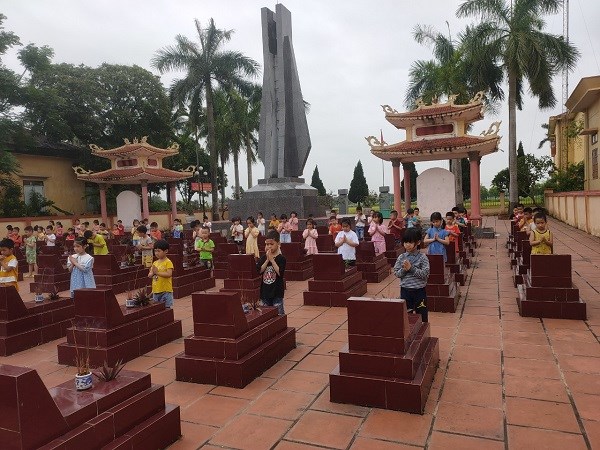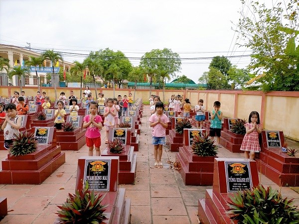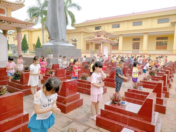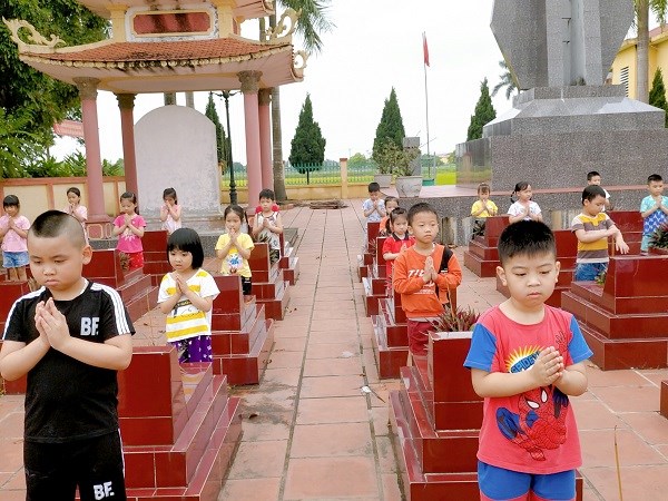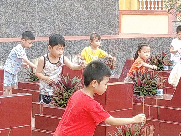 Sau nghi thức viếng, các con được các cô giáo hướng dẫn lần lượt đi thắp hương các phần mộ anh hùng liệt sỹ tại nghĩa trang, việc làm tuy nhỏ nhưng có ý nghĩa giáo dục sâu sắc đối với các con. Để thể hiện lòng biết ơn đối với các anh hùng liệt sỹ, các con hãy chăm ngoan học giỏi để sau này góp sức xây dựng quê hương đất nước ngày càng giàu, đẹp hơn.