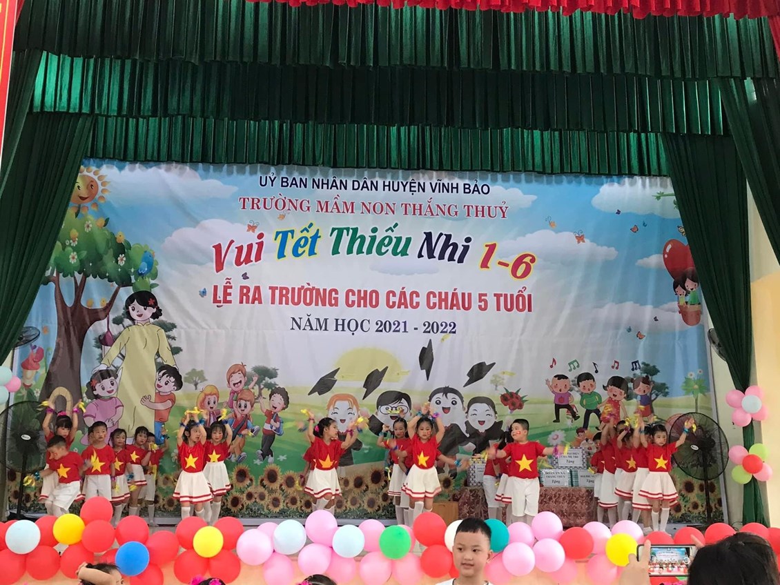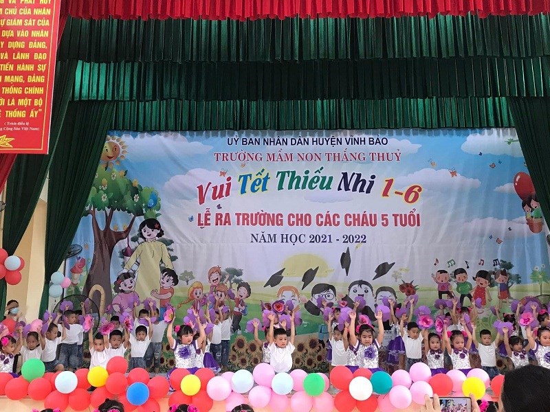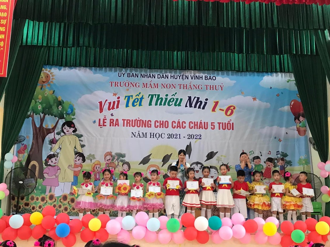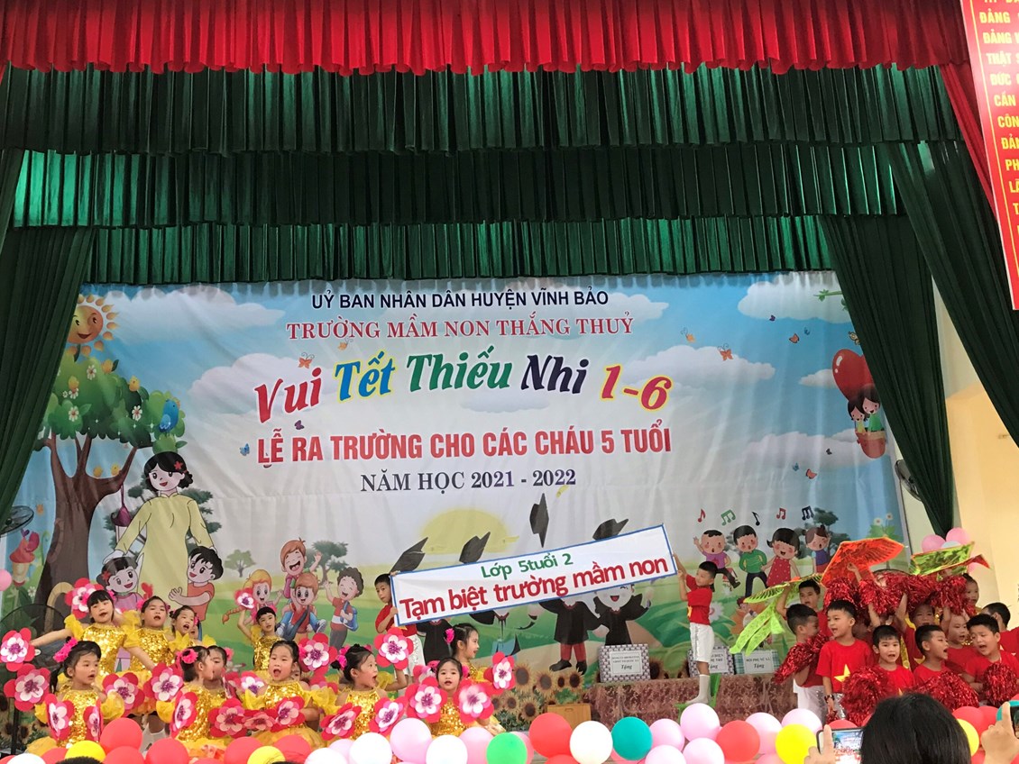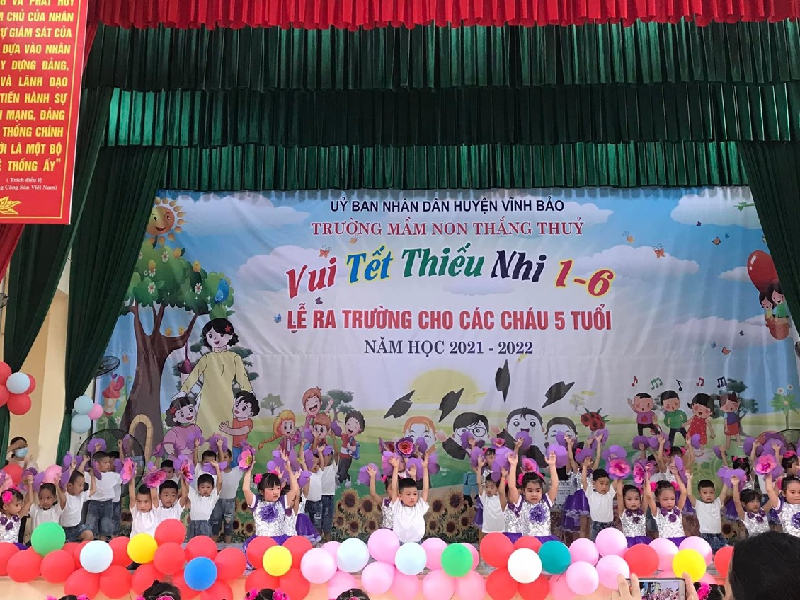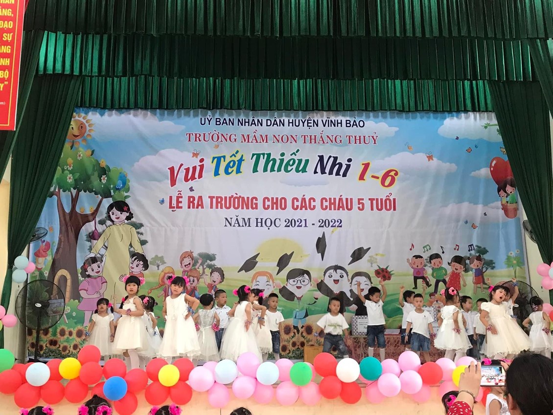 Sáng ngày 31/05/2022, trường mầm non Thắng Thủy tổ chức Chương trình “Vui tết thiếu nhi 1/6 và lễ ra trường cho trẻ 5 tuổi”. Tới dự buổi lễ có các đồng chí đại diện lãnh đạo địa phương, các ông bà là bí thư chi bộ, Ban đại diện cha mẹ trẻ cùng tập thể cán bộ, giáo viên, nhân viên và các cháu lớp mẫu giáo trường mầm non Thắng Thủy