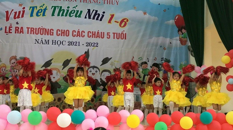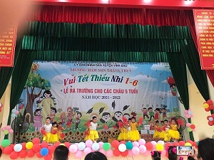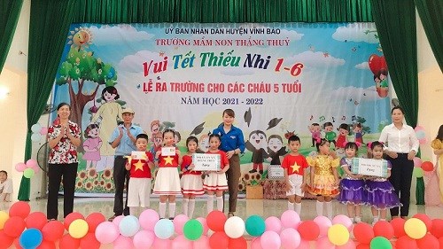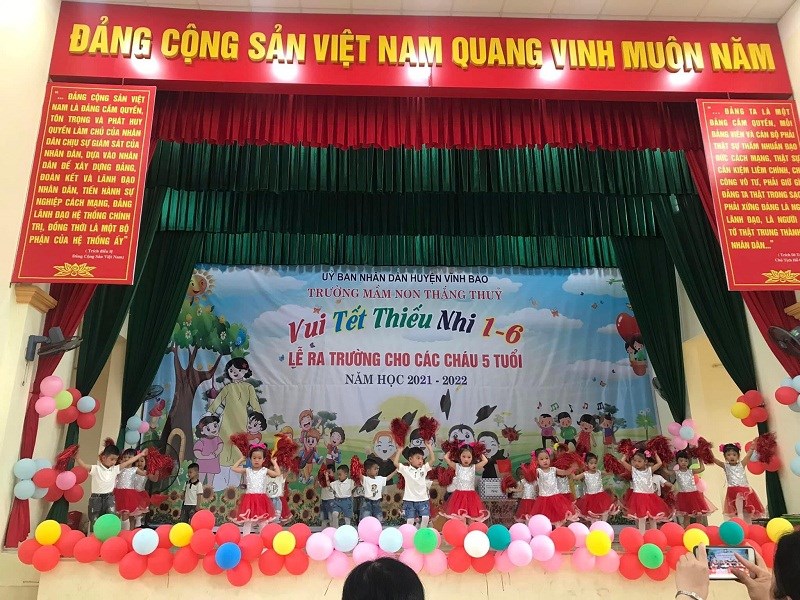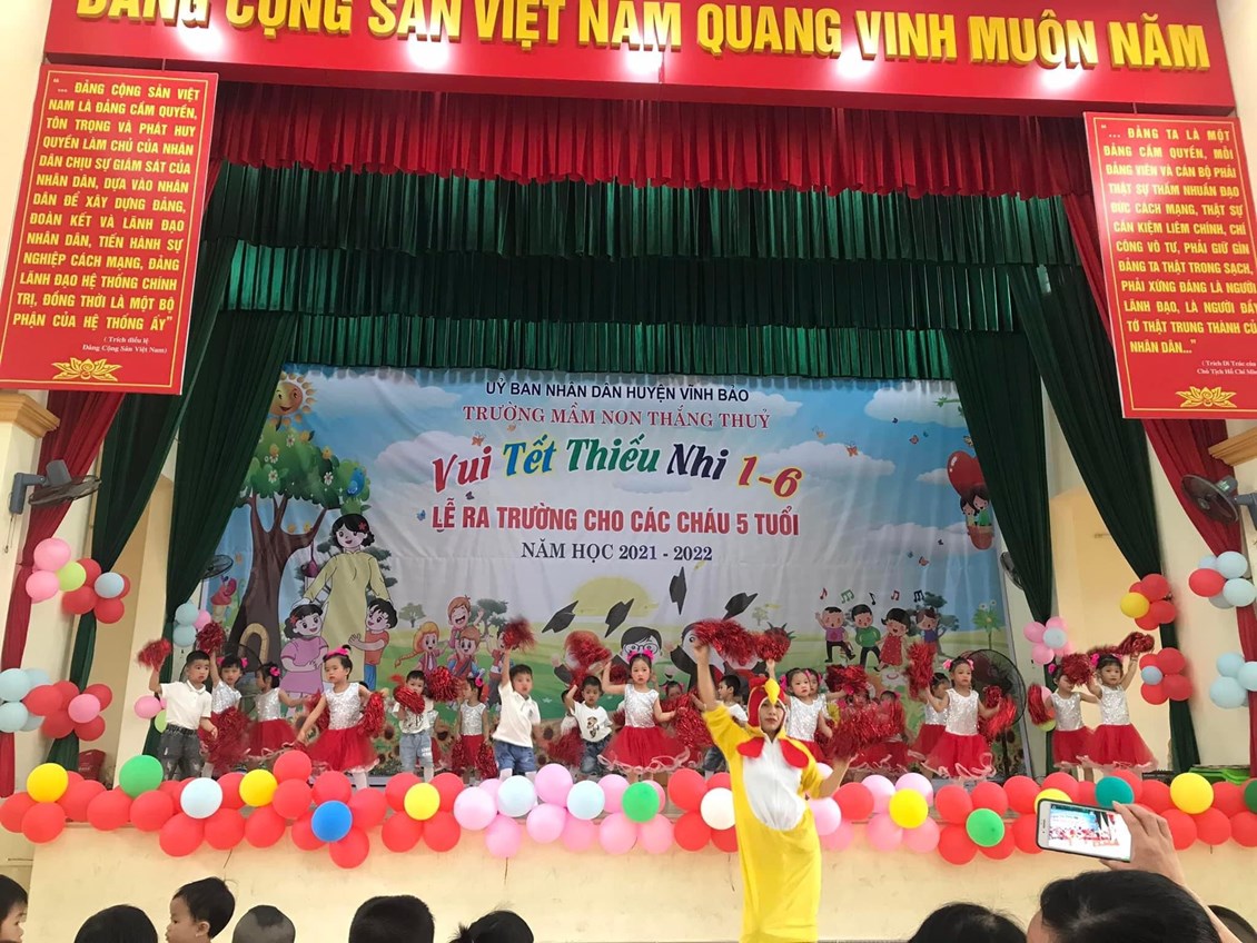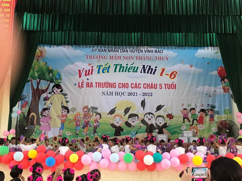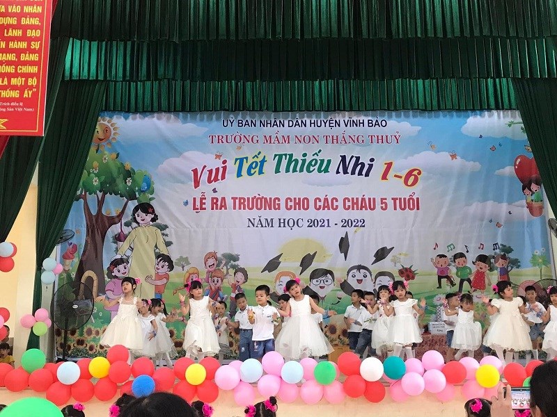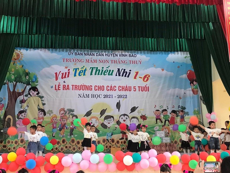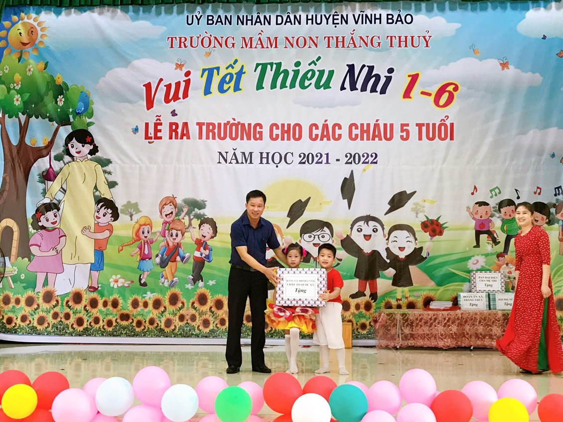 Sáng ngày 31/05/2022, trường mầm non Thắng Thủy tổ chức Chương trình “Vui tết thiếu nhi 1/6 và lễ ra trường cho trẻ 5 tuổi”. Tới dự buổi lễ có các đồng chí đại diện lãnh đạo địa phương, các ông bà là bí thư chi bộ, Ban đại diện cha mẹ trẻ cùng tập thể cán bộ, giáo viên, nhân viên và các cháu lớp mẫu giáo trường mầm non Thắng Thủy