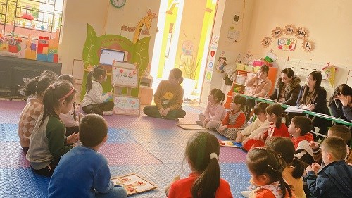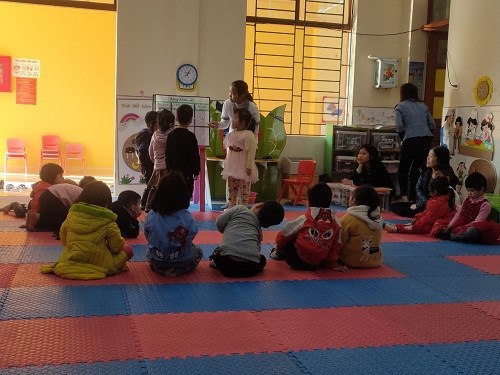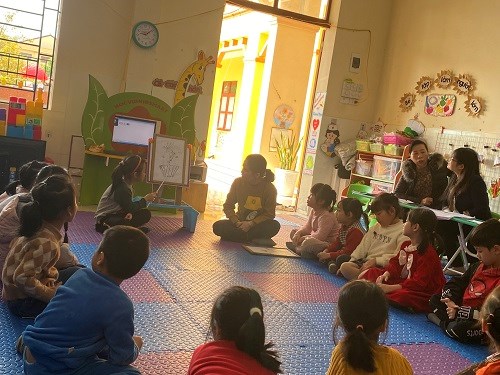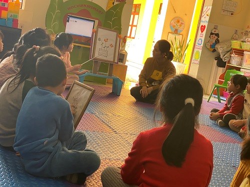 Cô cùng trẻ trò chuyện và đàm thoại về bưu thiếp của cô. Cô làm mẫu cho trẻ quan sát