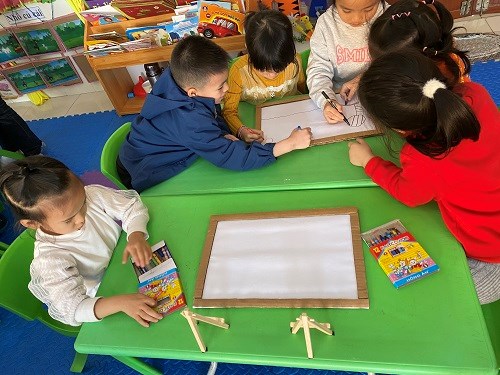 Cô nhắc trẻ phân công công việc cho từng thành viên trong nhóm để thực hiện. Cho trẻ lấy NVL về chỗ ngồi theo nhóm để thực hiện. Trẻ sử dụng các nguyên vật liệu để làm tranh theo bản thiết kế. Cô quan sát các nhóm thực hiện khuyến khích sự sáng tạo của trẻ